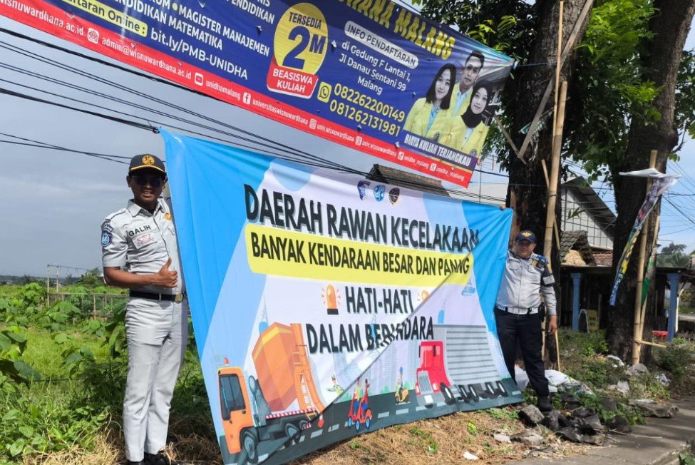 Haijatim.com, Malang – Bentuk upaya pencegahan dan penekanan angka laka lantas diwilayah Kabupaten Malang, Jasa Raharja laksanakan giat pemasangan spanduk himbauan laka bersama Satlantas Polres Malang Kamis (26/6). Kegiatan ini adalah salah satu bentuk komitmen dalam upaya penurunan angka kecelakaan.