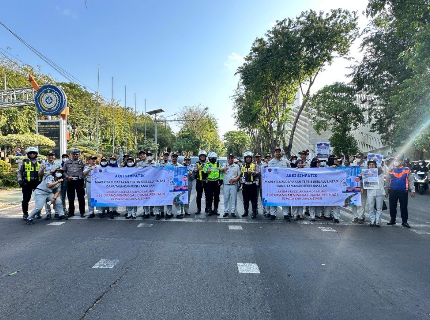 Haijatim.com, Surabaya – PT Jasa Raharja Cabang Surabaya berkolaborasi Bersama PT Jasa Raharja Kantor Wilayah Utama Jawa Timur menggandeng Polrestabes Surabaya dan Dinas Perhubungan Kota Surabaya menggelar kegiatan Aksi Simpatik pada hari Jum’at, 25 Juli 2025 bertempat di Jalan Raya Simpang Darmo Kebun Binatang Surabaya dengan memberikan Coklat dan Souvenir berupa Gantungan kunci yang bertuliskan Pesan Keselamatan Berlalu Lintas kepada pengguna jalan yang melintas di Jl Raya Darmo Surabaya.